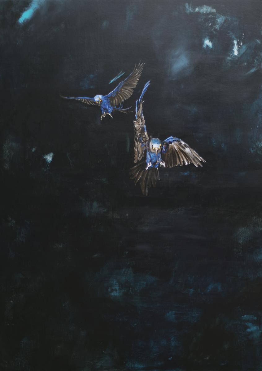Una parete dipinta con i colori e le magiche imperfezioni delle profondità marine che convivono con i guizzi e le pennellate dell’artista dando vita alla sua Vandalizzazione, cifra artistica dell’artista. Acqua e fuoco, forze contrapposte ma complementari: l’una riscalda l’altra rinfresca ma entrambe sono indomabili e capaci di forze distruttive.