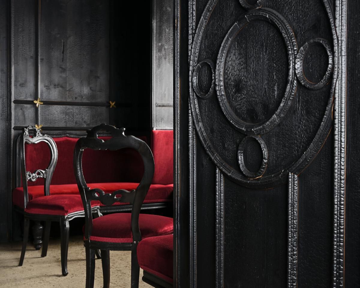 Da un’intuizione dell’artista sul materiale e dal mio intervento creativo prende vita anche un progetto di pannelli per boiserie in effetto carbonizzato con l’inserimento di elementi decorativi, che rivestiranno anche un arredo bagno della linea Itlas.