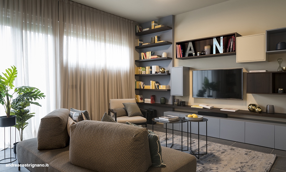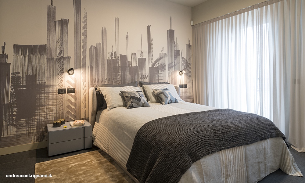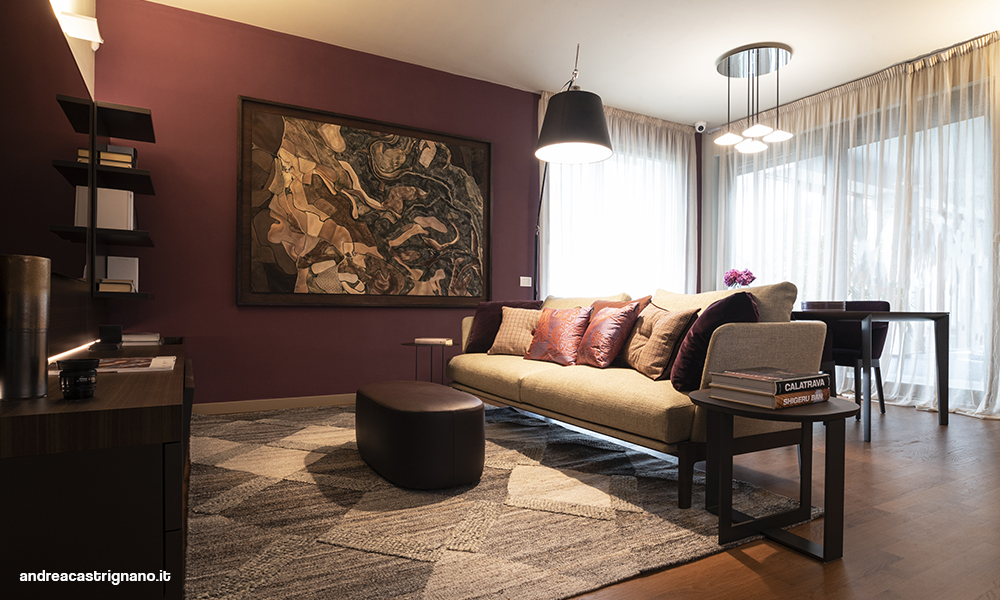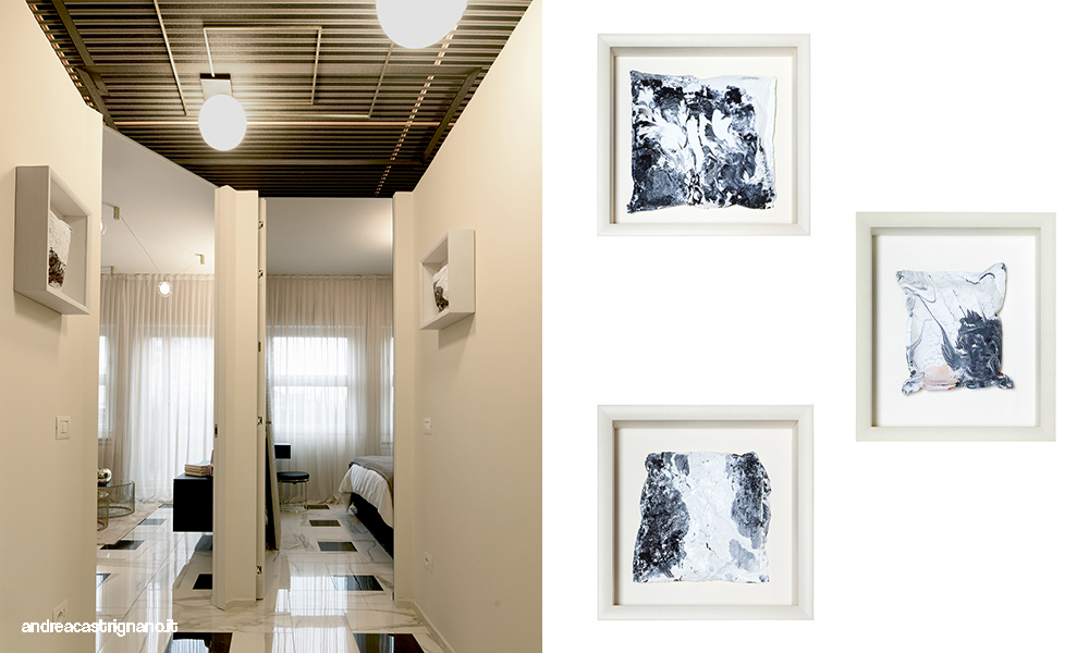 Un esempio di scelte armoniche è il progetto “Una suite per mamma e papà” nel quale per l’ingresso abbiamo rispettato il tema del bianco e nero anche per le opere d’arte, e per il soggiorno – il più classico dei posizionamenti sopra il divano – ho inserito una grande tela di Brigitta Rossetti, molto materica, nella quale i guizzi di colore si rispecchiavano nei dettagli del progetto.