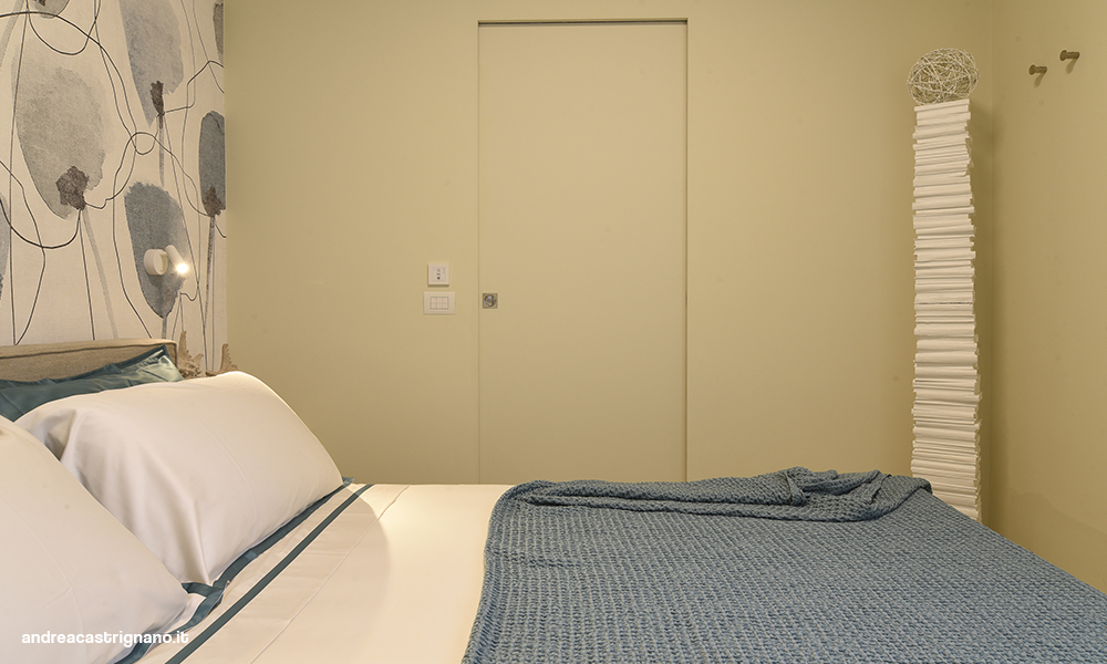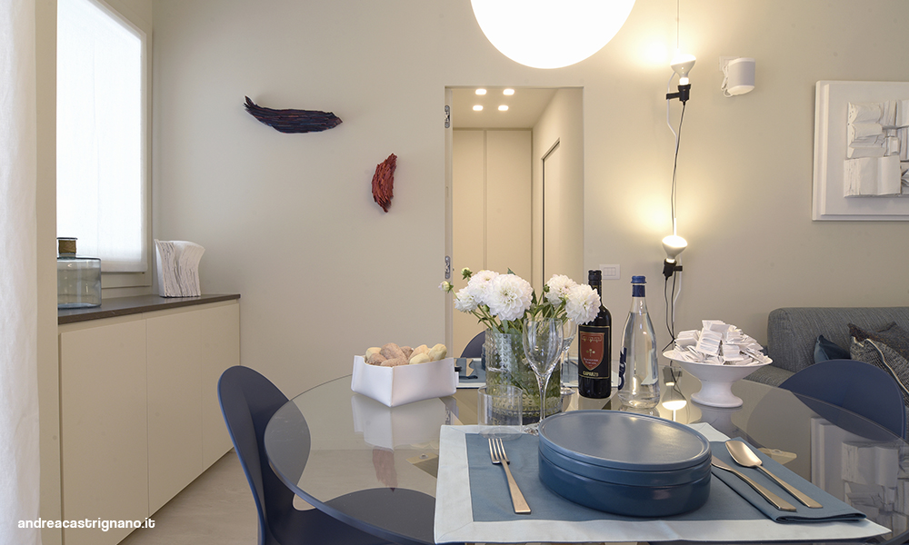 In ambienti non troppo grandi, laddove si vuole inserire un’opera che catturi l’attenzione senza esagerare nelle dimensioni, prendo in considerazione le opere scultoree, da appoggio o da appendere. È stato il caso del progetto della villetta al mare nel quale volevo mantenere un effetto generale di leggerezza.