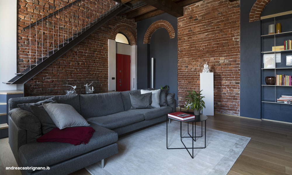 La zona giorno, al piano terra, è caratterizzata dalla parete in mattoni rossi sulla quale non era consigliabile appendere un’opera, ma necessitava di essere contrastata cromaticamente. Una scultura da terra era la giusta scelta: è un’opera di Rudy Pulcinelli, in ferro verniciato bianco, una riflessione sul tema della comunicazione dove le lettere in metallo si sovrappongono e aggrovigliano per riuscire a passare nell’altro spazio, come in una sorta di clessidra linguistica.