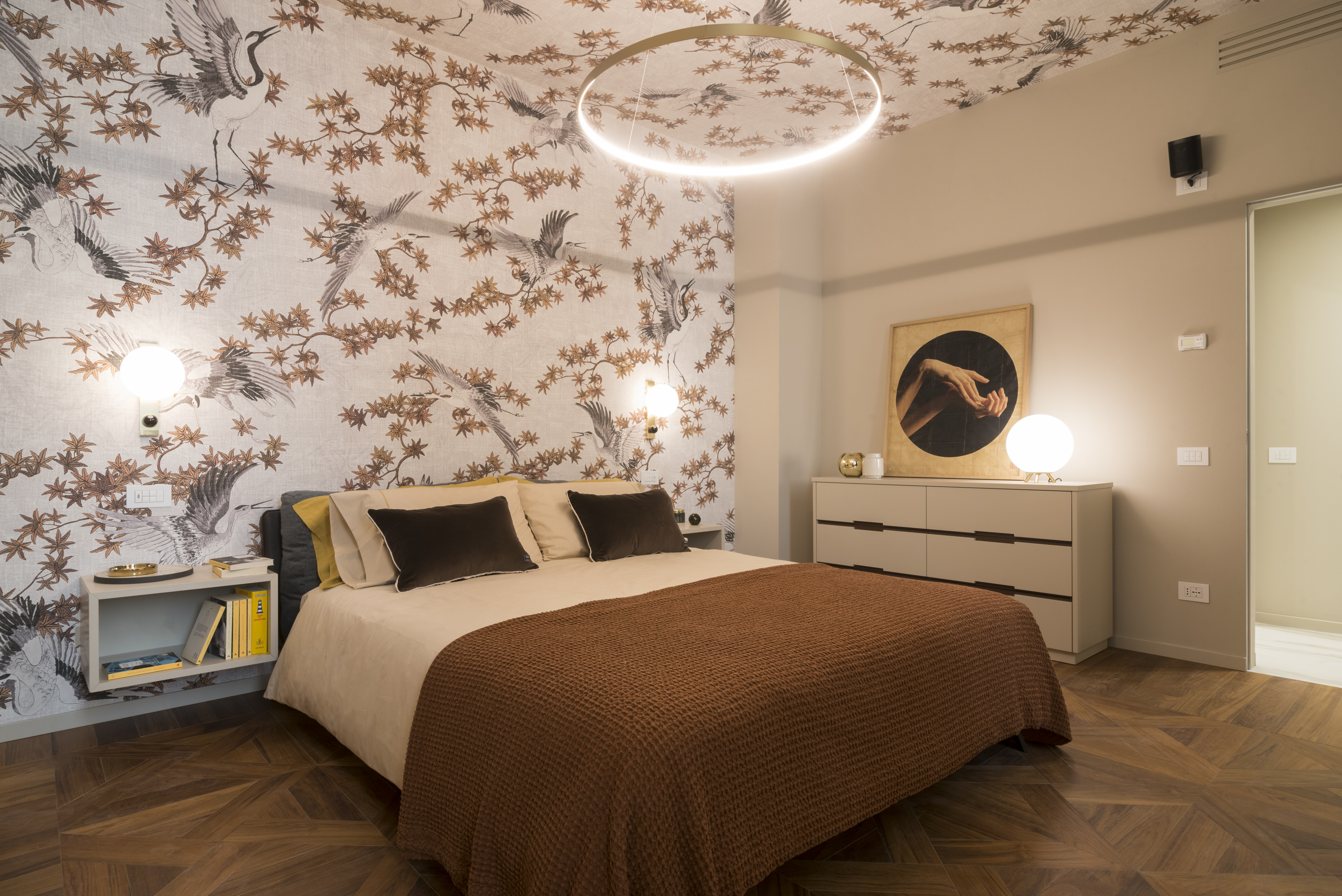 Considerato che le due abitazioni sono state progettate con stili totalmente diversi, ho cercato di rispettare l’anima di ogni singolo progetto selezionando artisti molto diversi tra loro sia nel gusto estetico che anche nella resa fotografica: opere intimiste, senza tempo o connotazione ambientale, morbide nei colori e meditative per l’appartamento di Paola, opere più contemporanee con colori accesi e resa fotografica più vicina al mondo del cinema per quello di Simona.