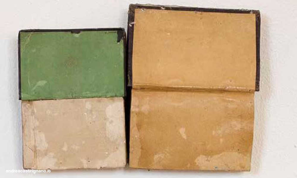 Abbiamo scelto di collocare nel grande e luminoso bagno di Francesca alcune opere di piccolo formato, in particolare della serie “Casette”: sono libri e breviari, ricoperti di pigmenti e cera, trasformati dall’artista in opere d’arte compatte, misteriose, elegantissime.