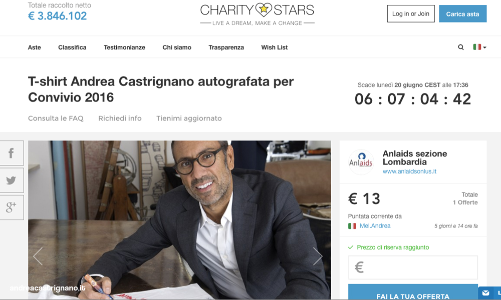 Carissimi tutti, dopo la serata conclusiva di Convivio 2016, dove ho avuto l’onore di partecipare e collaborare attivamente alla lotta contro l’AIDS, sono felice di annunciarvi che sul portale Charity Stars potrete trovare la maglia by Oviesse edizione speciale Be a Fashion Victim da me indossata e autografa. Correte a dare il vostro contributo e a fare shopping a fin di bene!