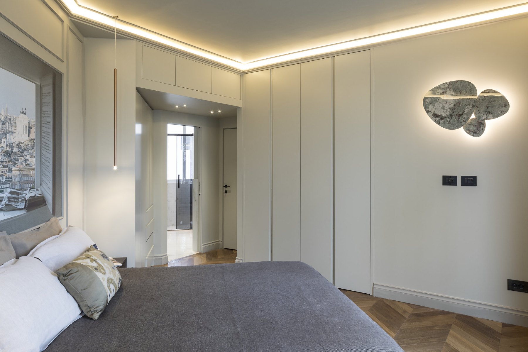 La camera da letto è un’oasi di tranquillità, dove i toni caldi e i tessuti morbidi creano un’atmosfera rilassante. Il letto, con testiera imbottita, è affiancato da comodini minimalisti e lampade dal design sofisticato. Le tende leggere filtrano la luce naturale, conferendo all’ambiente una luminosità diffusa. Una cabina armadio su misura offre ampio spazio per l’organizzazione del guardaroba.