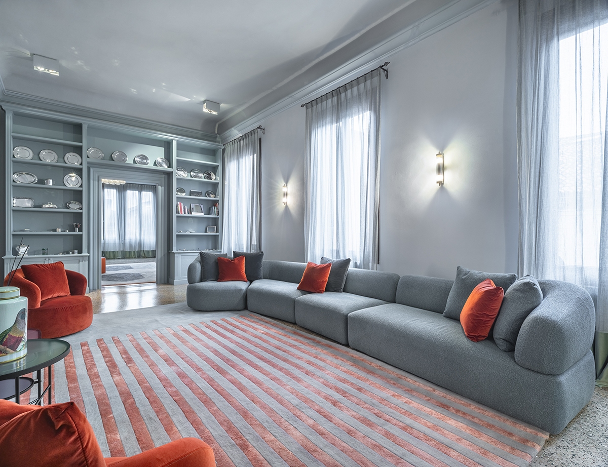 Il grande soggiorno, diviso in due ambienti: uno dedicato alla conversazione e l’altro alla zona TV, si distingue per la sua luminosità e l’uso sapiente dei colori. I grandi divani angolari sono arricchiti da cuscini in tessuti pregiati che aggiungono un tocco di colore e comfort. Le pareti sono decorate con gli stucchi originali e il wallpaper che riproduce un’architettura veneziana, creando un’atmosfera rilassante, elegante e sofisticata. I tappeti geometrici definiscono le aree lounge, mentre l’illuminazione a soffitto, a parete e da terra contribuisce a valorizzare gli spazi.