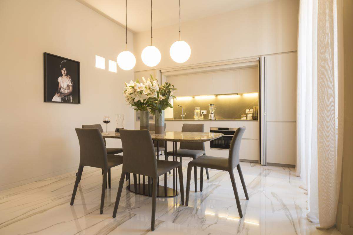 Uno dei pezzi forti dell’appartamento di Paola sarà la cucina. Dato che ho a che fare con un ambiente unico, devo riuscire a creare una zona cottura che non stoni con il resto dell’arredamento del locale. Per questo ho pensato a una cucina con quattro ante a scomparsa fresate. Così verrà a crearsi una continuità con il particolare mobile tv della zona living e inoltre l’open space sarà sempre ordinato. Per il top suggerisco di richiamare i toni neutri e caldi dell’ambiente e, dato che lo stile della casa è molto ricercato, collocherei un tavolo in prezioso marmo, con venature che riprendono quelle del pavimento e alcune tonalità dell’affresco.