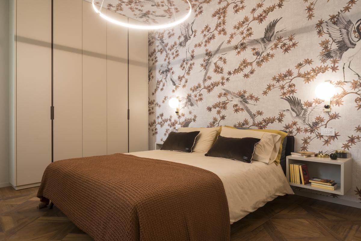 Sempre in camera da letto, ho dato un tocco di originalità con una carta da parati che richiamasse i colori dell’arredamento, posizionata dietro la testata del letto fino a ricoprire il soffitto. Anche la fantasia si confà perfettamente all’ambiente, con un disegno raffinato e molto particolare.