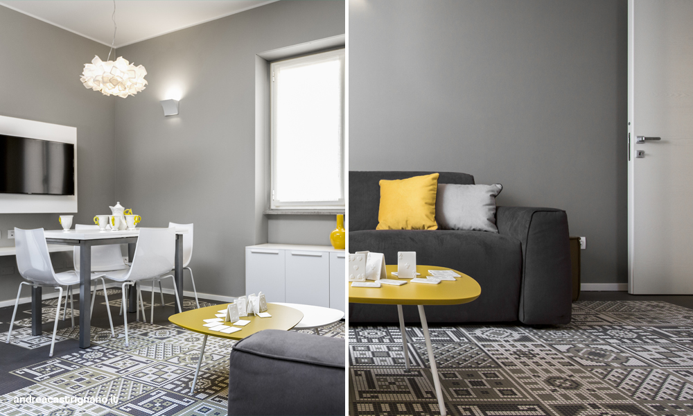 Il soggiorno, molto luminoso, ospita (insieme all’ingresso) la vera sorpresa di casa! Un pavimento interamente rivestito di [tooltip tip=”Appiani”]mosaico[/tooltip] e negli accessori un pizzico di giallo, il colore preferito di Elisabetta! L’effetto è davvero particolare e proseguirà anche nella camera da letto e in bagno. E per le visite del fratello Edoardo? Ho pensato a un [tooltip tip=”Felis”]divano letto[/tooltip], elegante e comodissimo!.