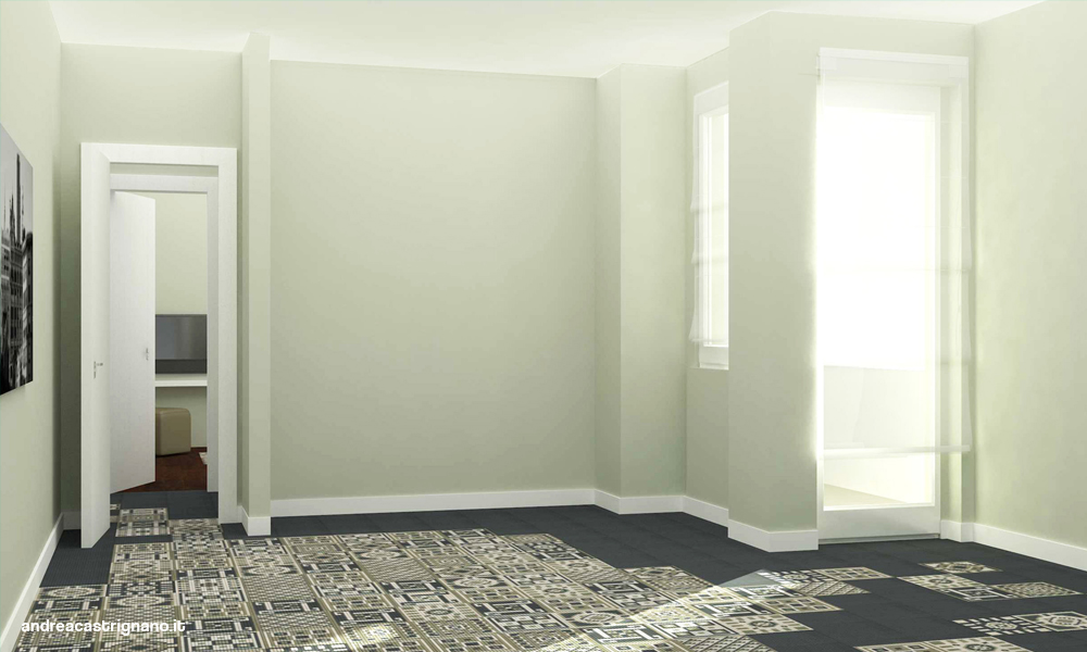 Il soggiorno, molto luminoso, ospita (insieme all’ingresso) la vera sorpresa di casa! Un pavimento interamente rivestito di [tooltip tip=”Appiani”]mosaico[/tooltip] e negli accessori un pizzico di giallo, il colore preferito di Elisabetta! L’effetto è davvero particolare e proseguirà anche nella camera da letto e in bagno. E per le visite del fratello Edoardo? Ho pensato a un [tooltip tip=”Felis”]divano letto[/tooltip], elegante e comodissimo!.