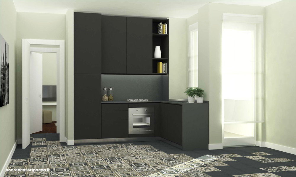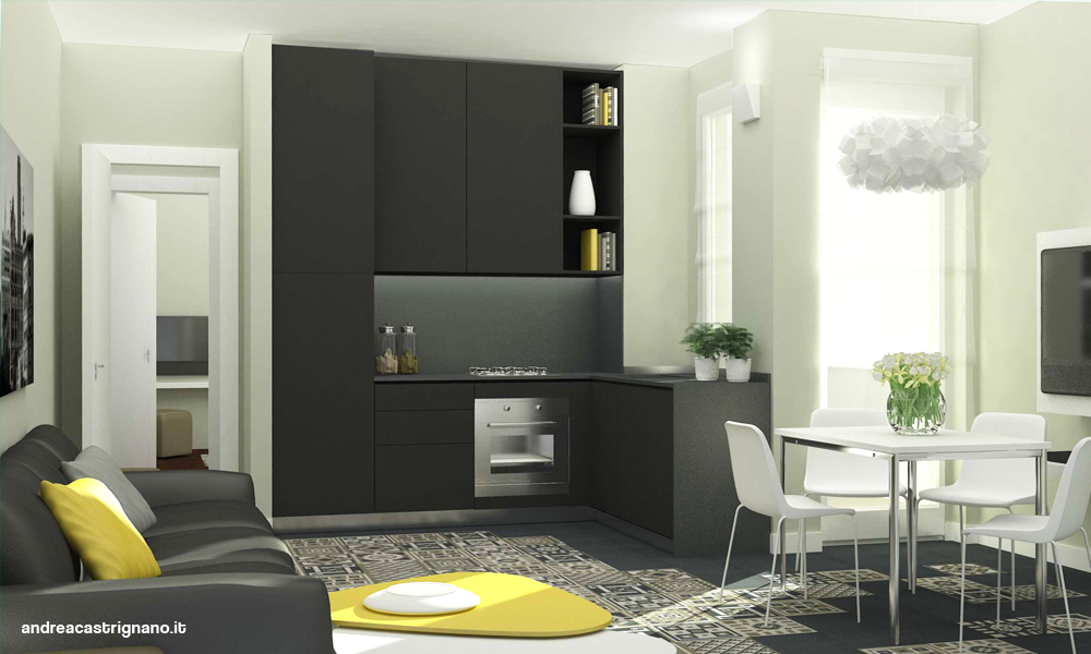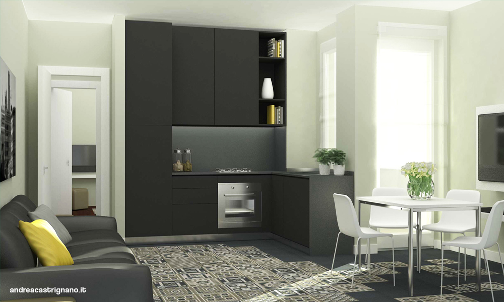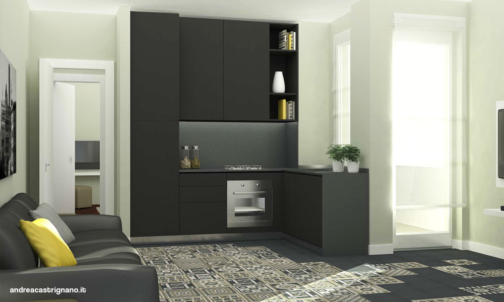 L’appartamento sarà vissuto principalmente da Elisabetta – Edoardo si appoggerà solo raramente, per preparare e dare gli ultimi esami – una ragazza frizzante che come linee guida da seguire nell’elaborazione del concept mi ha esposto preferenze di stile e passioni: dall’amore per il vitaminico colore giallo ai mosaici, passando per la cucina! Non me lo sono fatto ripetere due volte e sono partito subito progettato su misura per Elisabetta una [tooltip tip=”Ar-Tre”]cucina comoda e super funzionale[/tooltip]! Per renderla tale ho dovuto ampliarla e aprirla sul soggiorno – la cucina preesistente era praticamente larga e stretta quanto un corridoio!