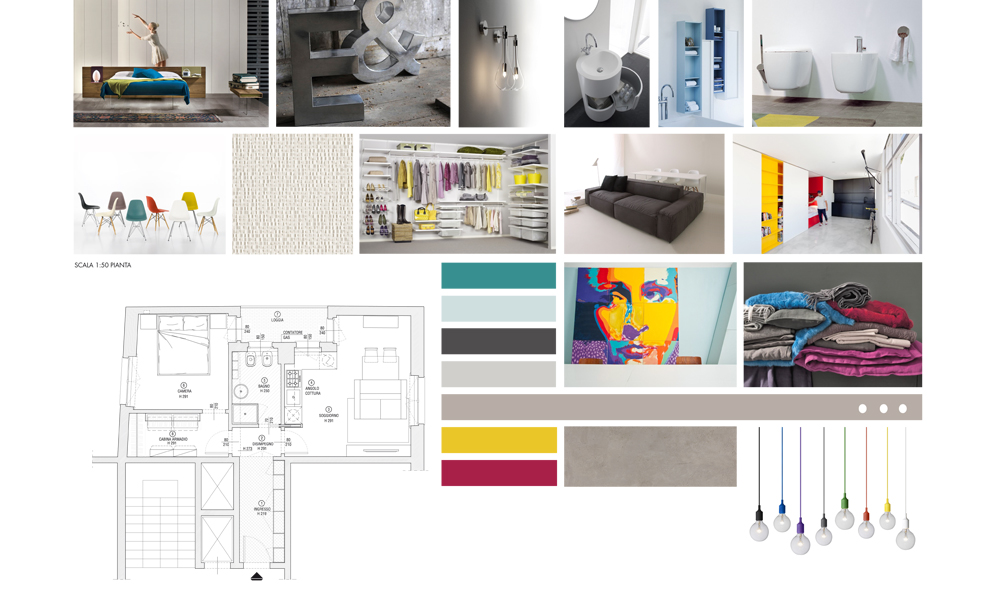Credits: Ar-Tre (cucina), Acf-Maronese (arredi zona living e camera), Appiani (mosaico), Calligaris (tavolino living), Artemide (lampade, luci), Compab (mobile arredo bagno), Duravit (box doccia e sanitari), Fantini (rubinetteria), Deltacalor (termoarredo), Agoprofil (porte), Galleria L’Image (manifesti originali del xx secolo), Seletti (oggettistica), Colombo Design (maniglie), Rapidmix (resina), Marmo Arredo (top cucina).