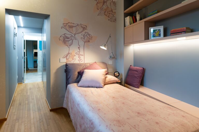 Scendiamo ora le scale e torniamo al piano terra, dove a parte l’ingresso troviamo le camere dei figli di Elina: Sofia e Mattia. Volevo che entrambi avessero il loro spazio in cui studiare, riposarsi e giocare, perciò ho studiato una soluzione che accontentasse tutti. La camera di Sofia è passante, per lei ho scelto i toni delicati del rosa e del grigio e ho inserito un wallpaper d’ispirazione floreale personalizzato. Proseguendo lungo il corridoio troviamo una zona dedicata alle armadiature, che in una casa come questa non sono mai troppe.