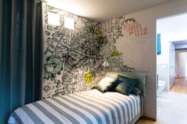 Proseguendo, dopo il bagno troviamo la camera di Mattia. Anche qui ho inserito un wallpaper personalizzato. Questa volta d’ispirazione street style. Il disegno infatti ricorda un murales. I colori che ho utilizzato in questo caso sono le tonalità del grigio alternate a quelle del verde, che rendono così l’ambiente il rifugio ideale per un’adolescente che ha un suo stile e sue esigenze specifiche.