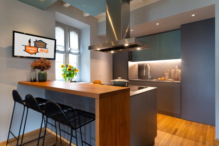 Salendo pochi gradini arriviamo alla cucina, tutta realizzata attraverso la falegnameria su misura. Lo spazio a disposizione non era enorme ma sono riuscito ad ottimizzarlo al meglio. Volevo che i miei committenti cucinassero vista lago. Perciò ho creato un’isola dove ho inserito la piastra ad induzione. Dato che la cucina si trova in un open space è stato fondamentale garantire un’ottima aspirazione. Per fare ciò ho predisposto una cappa sopra il piano cottura e ho nascosto tutti gli impianti grazie a un controsoffitto in cartongesso, a cui ho dato un tocco di carattere verniciandolo con il mio Hope. Ho pensato di inserire uno snack table, comodissimo da utilizzare per colazione o come appoggio.