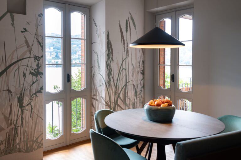 Nella zona pranzo, che gode di una vista spettacolare sul lago, ho fatto realizzare un wallpaper custom che riprendesse e richiamasse la natura. Il tavolo rotondo, per una questione di spazi a disposizione non è grandissimo. Perciò, per garantire a Elina e Sergio, di ospitare comodamente più persone a cena, ho pensato di inserire una panca.
