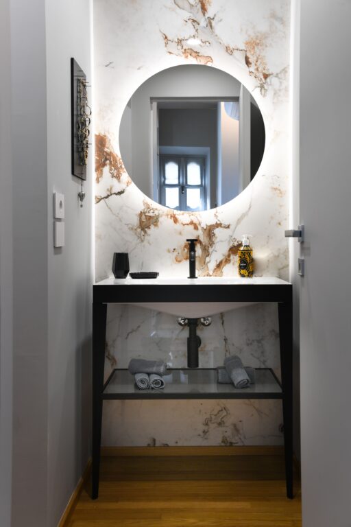 Lo spazio a disposizione era molto poco, ma è stato più che sufficiente per progettare un bagno di cortesia funzionale ed esteticamente molto bello. Il gres porcellanato effetto marmo è funzionale ed elegante. Il lavabo d’ispirazione industrial si inserisce perfettamente nell’ambiente e i sanitari minimali e di design arredano senza appesantire troppo l’ambiente. Il tocco in più? La rubinetteria nera che dona carattere e personalità all’ambiente.