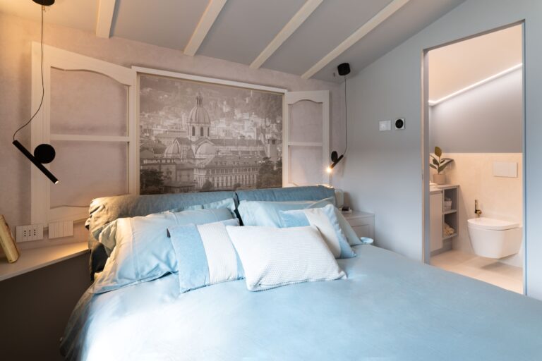 Salendo di un piano arriviamo alla camera padronale, piccolina ma completa. La mia parte preferita? Il wallpaper. Anche questa camera gode di una deliziosa vista lago, ma questa volta non mi bastava. Ho infatti, fatto realizzare appositamente per i miei committenti, una carta da parati raffigurante una vista di Como Città, e l’ho incorniciata come se fosse una finestra vera e propria. Elina e Sergio dalla loro camera da letto avranno così una vista a 360 gradi sulla città che tanto amano!