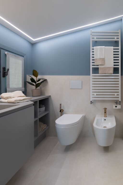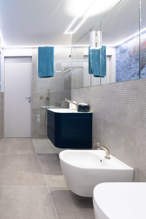 Poteva mancare il bagno en suite? Ovviamente no! Qui mi sono lasciato ispirare prevalentemente dai toni chiari e devo dire che il mio Blu Balena esalta perfettamente gli arredi chiari. Questa volta ho scelto una rubinetteria con una finitura in oro francese che impreziosisce e da un tocco di sofisticatezza a tutto l’ambiente.