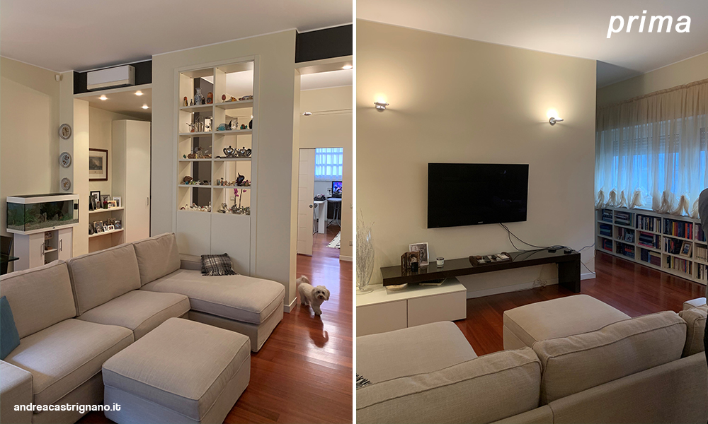 La casa dei genitori di Federica è un appartamento ampio e luminoso ma necessita di un tocco di stile e di alcuni interventi strutturali per aprire l’ingresso sul soggiorno e sfruttare al meglio la metratura a disposizione. Federica mi elenca le problematiche riscontrate da lei e dai suoi genitori: il parquet risulta usurato e la finitura scura appesantisce in maniera eccessiva il soggiorno, vorrebbero un pavimento più luminoso e pratico, adatto anche alla loro cagnolina.