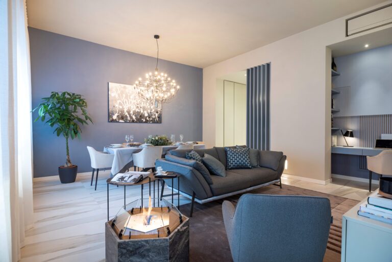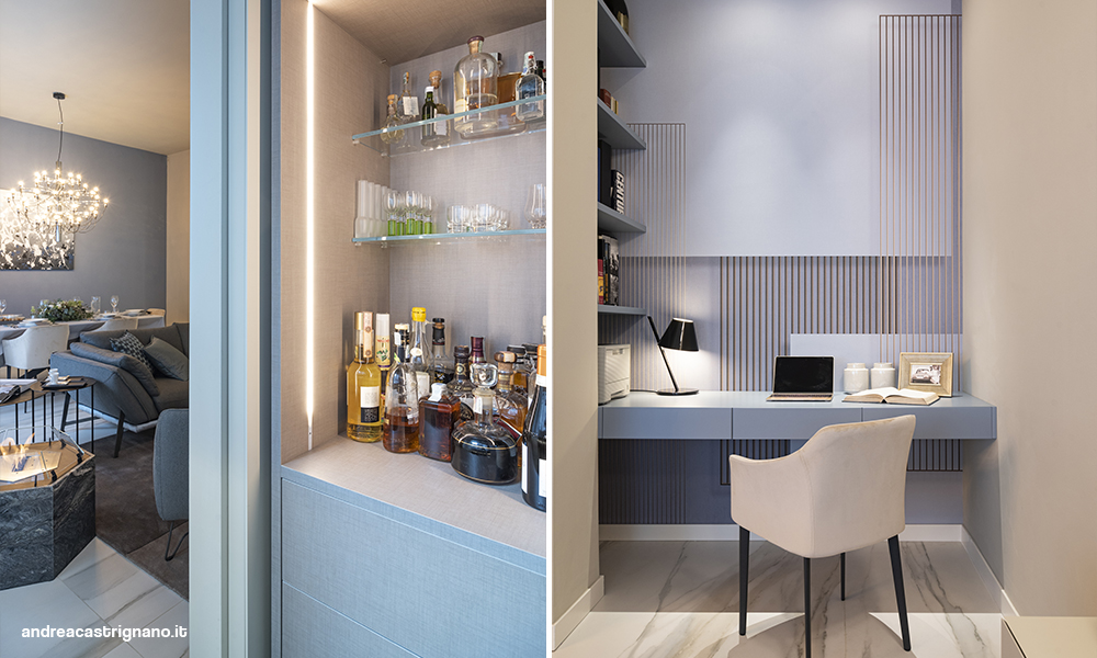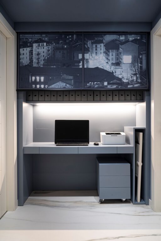 Ho applicato un wallpaper con motivo geometrico nella nicchia che ho ricavato in soggiorno per una delle due postazioni di smart working che, nella trama, richiama il layout del separé in ingresso. Ho voluto creare una scrivania sospesa su misura dal design sottile e pulito che potesse somigliare ad una mensola ed inserirsi con discrezione nel contesto del salotto. Il piano laccato anch’esso Blu Balena è completato da tre cassetti a scomparsa con angolo a 45°. Lateralmente, ho predisposto degli scaffali celati dietro al pilastro dove riporre faldoni, documenti e cancelleria senza che siano visibili!