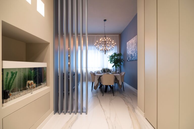 Iniziamo dall’ingresso che ho ridisegnato in funzione di spazi più ampi e ariosi e nel quale ho inserito l’acquario del papà di Federica, che finalmente ha trovato il suo posto ideale. Il nuovo controsoffitto ospita i faretti ad incasso che adesso illuminano in maniera adeguata l’ingresso.