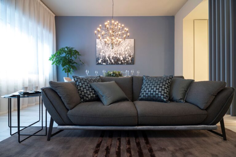 Nella zona living, ho creato uno sfondo colorato Blu Balena utilizzando una pittura lavabile acrilica, contrapposto agli altri muri del soggiorno, che ho invece decorato con un tenue color sabbia. Al centro della parete spicca un’opera pittorica che ricorda i graffiti della street art. Lo sfondo sfumato e le macchie di pittura della tela riprendono il colore accessorio, inserendosi con coerenza nella parete.