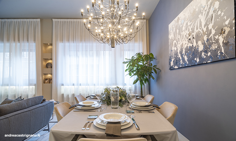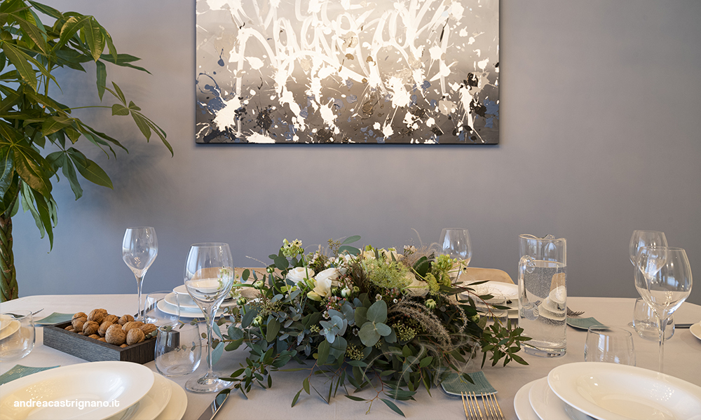 Ho voluto creare una mise en place elegante e di classe: ho scelto un servizio in porcellana bianca e tonalità neutre per i tessili, posate in argento e un grazioso piattino per il pane che stacca con delicatezza richiamando i toni del soggiorno. Al centro una composizione floreale, immancabile in una bella tavola.