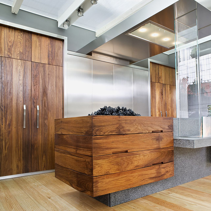 Studiata per essere utilizzata in ambienti esterni quali patii, gazebi, balconi e naturalmente anche all’interno. I materiali utilizzati: teak massello, acciaio, granito e casse idrofughe, hanno caratteristiche che rendono questa cucina non attaccabile da agenti esterni quale umidità e salsedine. Particolare e suggestivo è il camino ad alcool integrato nell’isola centrale che in momenti conviviali dona suggestione e calore all’ambiente.