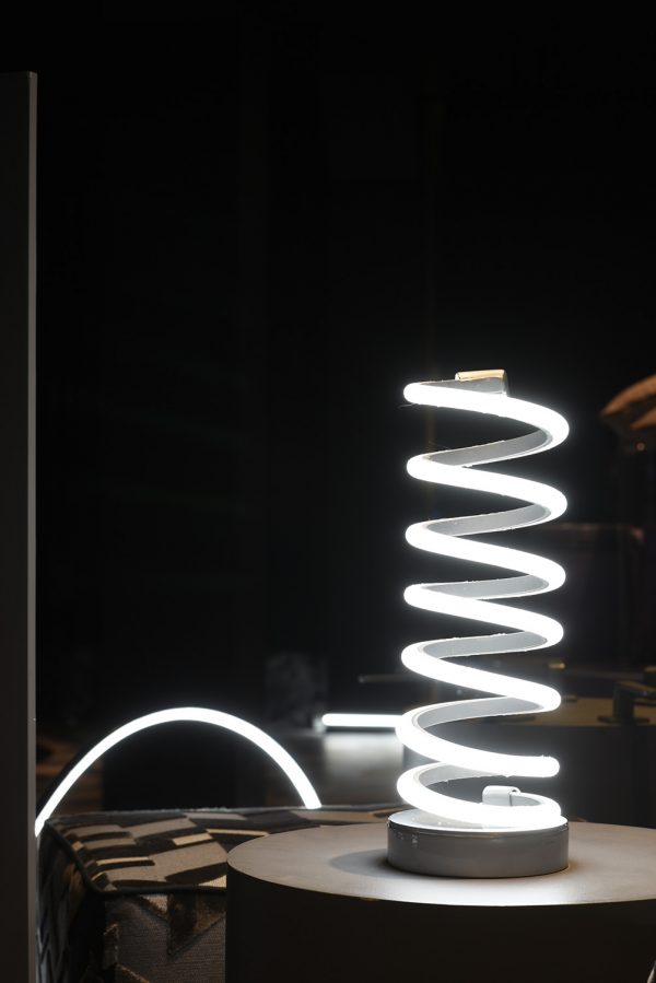 Snake, moderna lampada da tavolo e da terra dal design sinuoso e versatile che reinterpreta la classica forma a molla in una spirale luminosa dal deciso impatto decorativo e dall’anima dinamica. Una leggera struttura in metallo avvolge un tubo in silicone al cui interno è racchiusa la fonte luminosa a led.