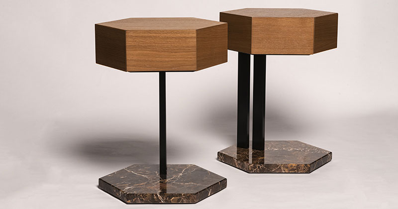 Double Hexagon è il comodino esagonale con basamento in marmo e piano in legno con cassetto a scomparsa, uniti da un’essenziale struttura in metallo nero.