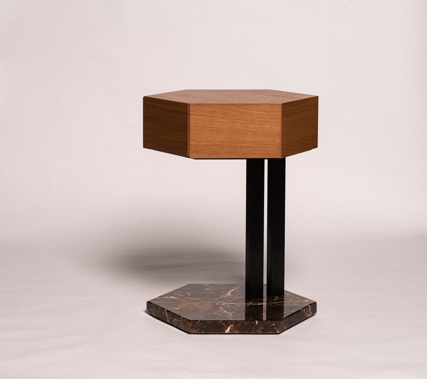 Double Hexagon è il comodino esagonale con basamento in marmo e piano in legno con cassetto a scomparsa, uniti da un’essenziale struttura in metallo nero.